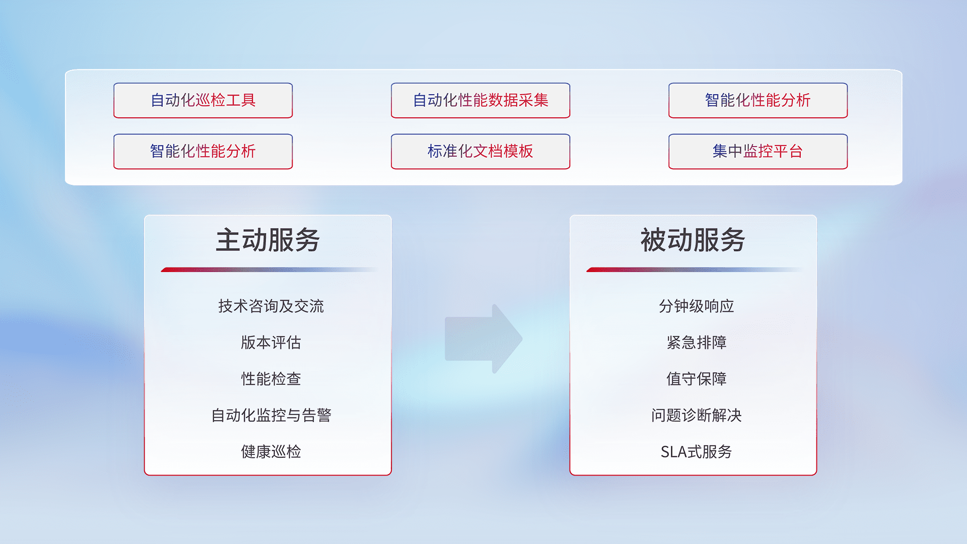 智能化工具和标准化文档,,,,保障服务质量,,,,提供主动服务(包含技术咨询、、、、版本评估、、性能检查、、自动化监控与告警、、、健康巡检)和被动服务包含(分钟级响应、、紧急排障、、、值守保障、、、、问题诊断解决、、、SLA服务)。。。